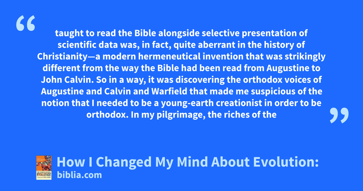 taught to read the Bible alongside selective presentation of scientific data was, in fact, quite aberrant in the history of Christianity—a modern hermeneutical invention that was strikingly different from the way the Bible had been read from Augustine to John Calvin. So in a way, it was discovering the orthodox voices of Augustine and Calvin and Warfield that made me suspicious of the notion that I needed to be a young-earth creationist in order to be orthodox. In my pilgrimage, the riches of the