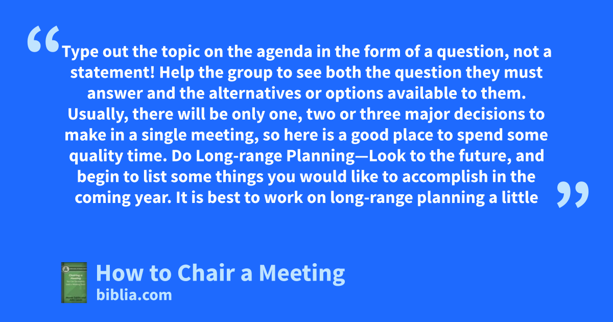 Type out the topic on the agenda in the form of a question, not a statement! Help the group to see both the question they must answer and the alternatives or options available to them. Usually, there will be only one, two or three major decisions to make in a single meeting, so here is a good place to spend some quality time. Do Long-range Planning—Look to the future, and begin to list some things you would like to accomplish in the coming year. It is best to work on long-range planning a little