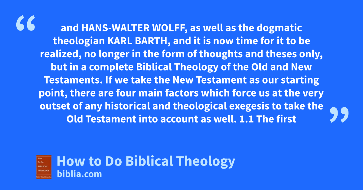 and HANS-WALTER WOLFF, as well as the dogmatic theologian KARL BARTH, and it is now time for it to be realized, no longer in the form of thoughts and theses only, but in a complete Biblical Theology of the Old and New Testaments. If we take the New Testament as our starting point, there are four main factors which force us at the very outset of any historical and theological exegesis to take the Old Testament into account as well. 1.1 The first