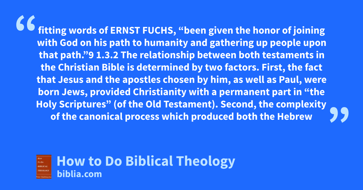 fitting words of ERNST FUCHS, “been given the honor of joining with God on his path to humanity and gathering up people upon that path.”9 1.3.2 The relationship between both testaments in the Christian Bible is determined by two factors. First, the fact that Jesus and the apostles chosen by him, as well as Paul, were born Jews, provided Christianity with a permanent part in “the Holy Scriptures” (of the Old Testament). Second, the complexity of the canonical process which produced both the Hebrew