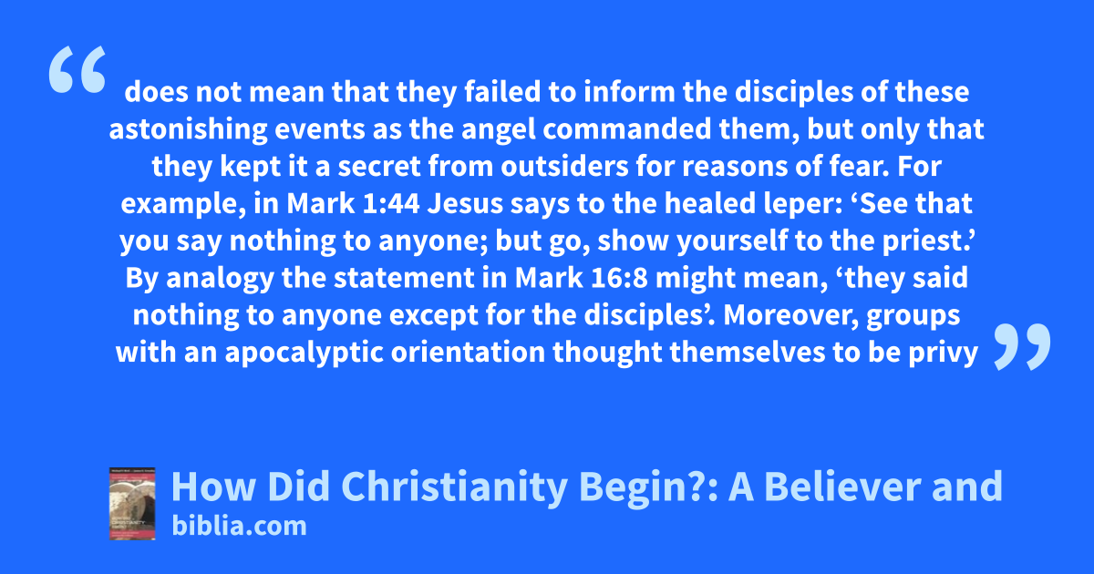 does not mean that they failed to inform the disciples of these astonishing events as the angel commanded them, but only that they kept it a secret from outsiders for reasons of fear. For example, in Mark 1:44 Jesus says to the healed leper: ‘See that you say nothing to anyone; but go, show yourself to the priest.’ By analogy the statement in Mark 16:8 might mean, ‘they said nothing to anyone except for the disciples’. Moreover, groups with an apocalyptic orientation thought themselves to be privy