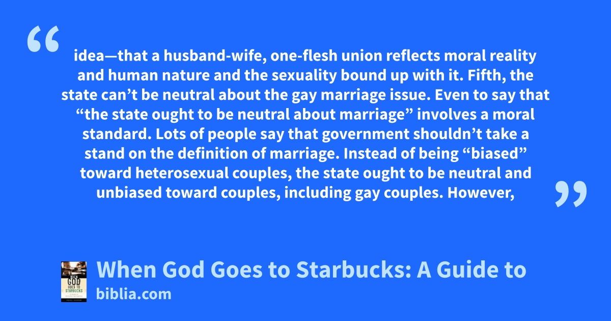 idea—that a husband-wife, one-flesh union reflects moral reality and human nature and the sexuality bound up with it. Fifth, the state can’t be neutral about the gay marriage issue. Even to say that “the state ought to be neutral about marriage” involves a moral standard. Lots of people say that government shouldn’t take a stand on the definition of marriage. Instead of being “biased” toward heterosexual couples, the state ought to be neutral and unbiased toward couples, including gay couples. However,