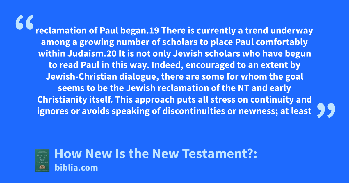 reclamation of Paul began.19 There is currently a trend underway among a growing number of scholars to place Paul comfortably within Judaism.20 It is not only Jewish scholars who have begun to read Paul in this way. Indeed, encouraged to an extent by Jewish-Christian dialogue, there are some for whom the goal seems to be the Jewish reclamation of the NT and early Christianity itself. This approach puts all stress on continuity and ignores or avoids speaking of discontinuities or newness; at least