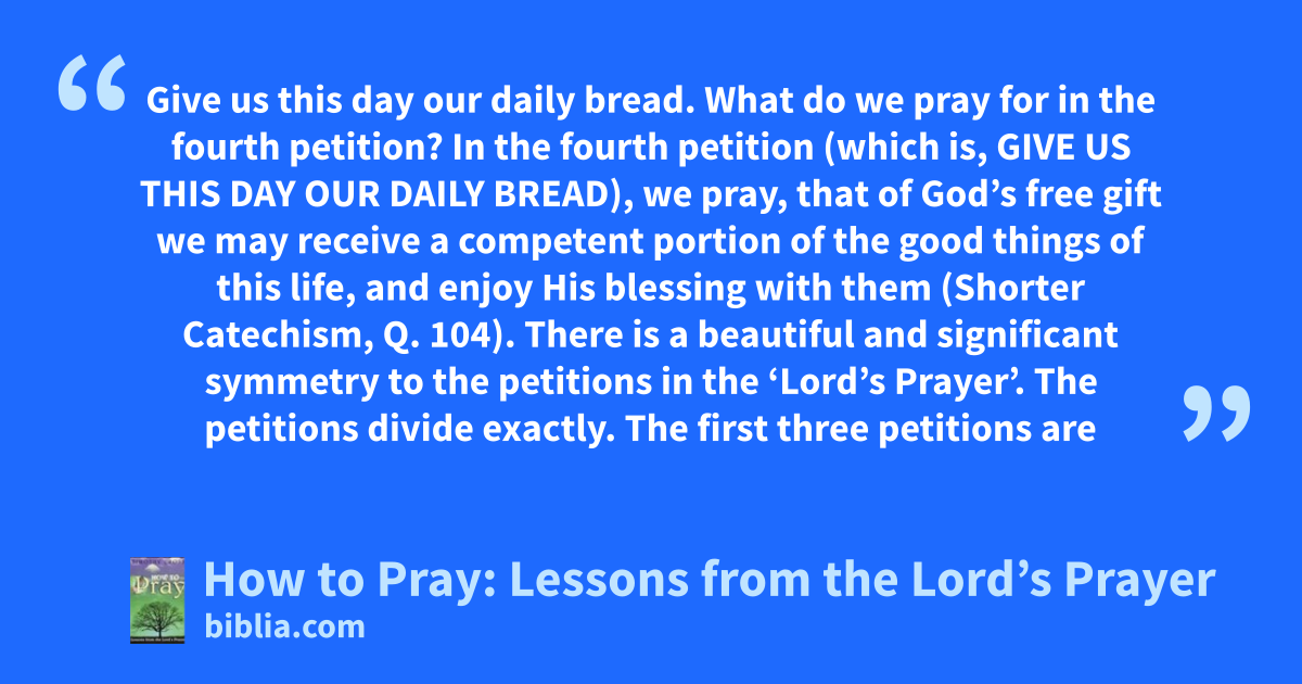 Give us this day our daily bread. What do we pray for in the fourth petition? In the fourth petition (which is, GIVE US THIS DAY OUR DAILY BREAD), we pray, that of God’s free gift we may receive a competent portion of the good things of this life, and enjoy His blessing with them (Shorter Catechism, Q. 104). There is a beautiful and significant symmetry to the petitions in the ‘Lord’s Prayer’. The petitions divide exactly. The first three petitions are