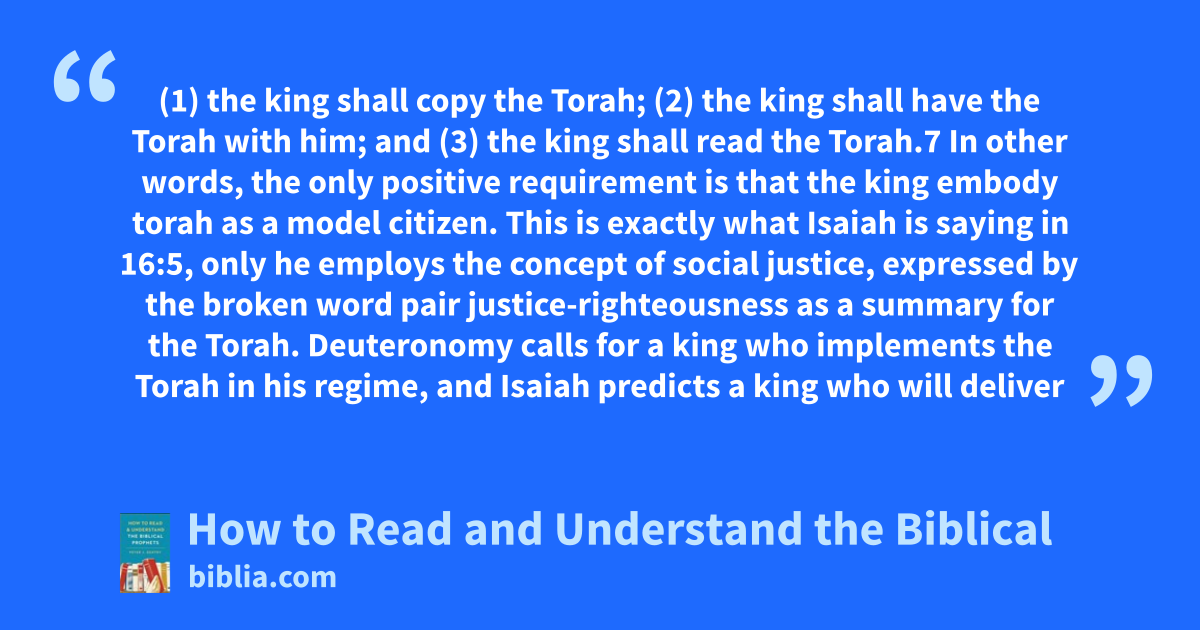 (1) the king shall copy the Torah; (2) the king shall have the Torah with him; and (3) the king shall read the Torah.7 In other words, the only positive requirement is that the king embody torah as a model citizen. This is exactly what Isaiah is saying in 16:5, only he employs the concept of social justice, expressed by the broken word pair justice-righteousness as a summary for the Torah. Deuteronomy calls for a king who implements the Torah in his regime, and Isaiah predicts a king who will deliver