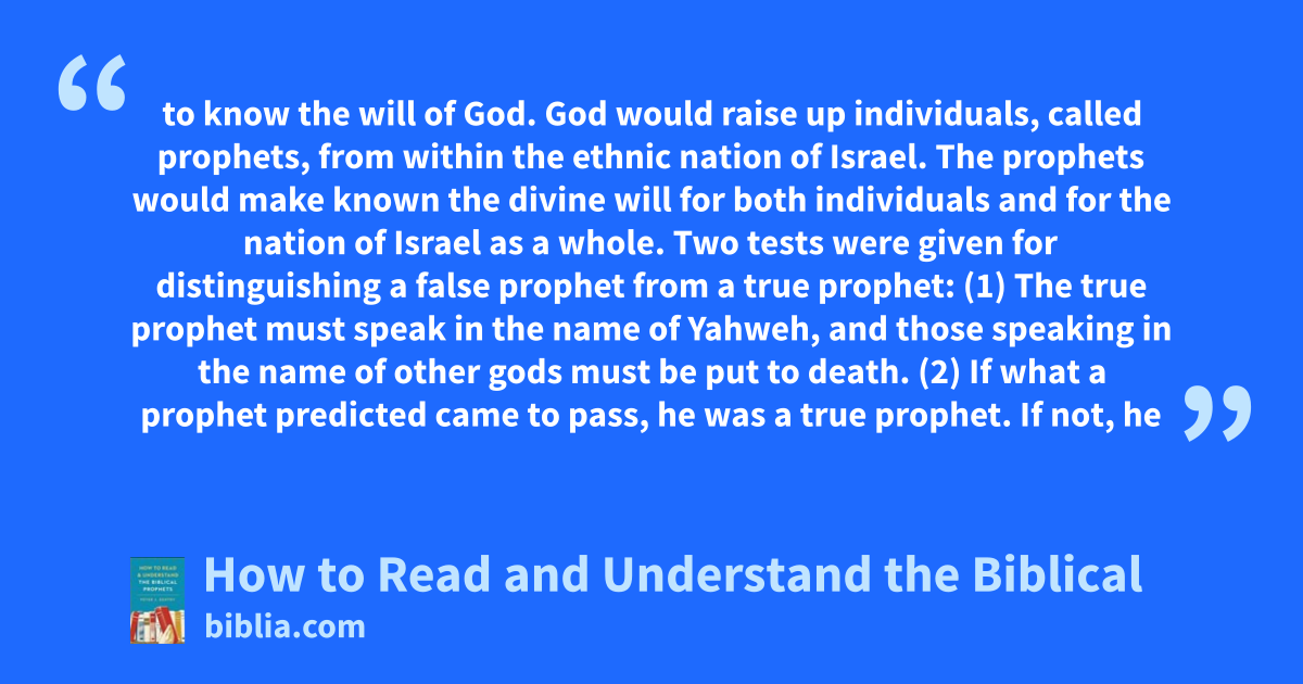 to know the will of God. God would raise up individuals, called prophets, from within the ethnic nation of Israel. The prophets would make known the divine will for both individuals and for the nation of Israel as a whole. Two tests were given for distinguishing a false prophet from a true prophet: (1) The true prophet must speak in the name of Yahweh, and those speaking in the name of other gods must be put to death. (2) If what a prophet predicted came to pass, he was a true prophet. If not, he