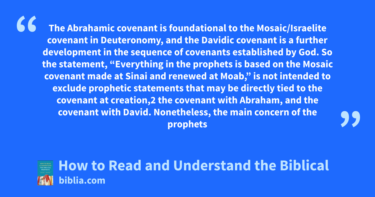 The Abrahamic covenant is foundational to the Mosaic/Israelite covenant in Deuteronomy, and the Davidic covenant is a further development in the sequence of covenants established by God. So the statement, “Everything in the prophets is based on the Mosaic covenant made at Sinai and renewed at Moab,” is not intended to exclude prophetic statements that may be directly tied to the covenant at creation,2 the covenant with Abraham, and the covenant with David. Nonetheless, the main concern of the prophets