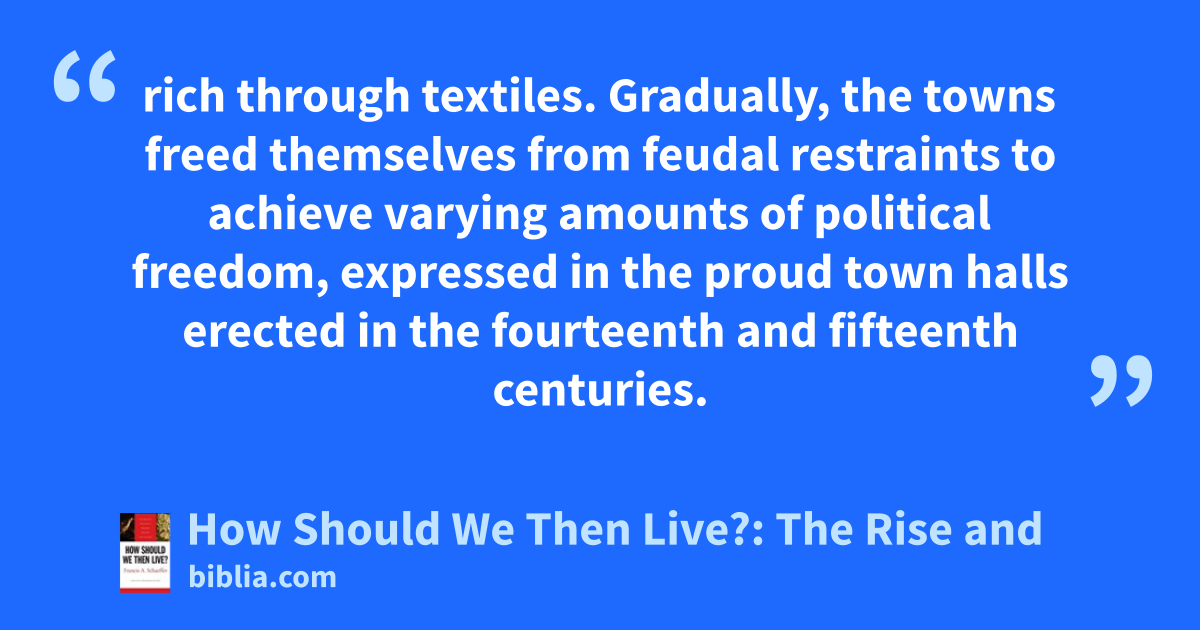 rich through textiles. Gradually, the towns freed themselves from feudal restraints to achieve varying amounts of political freedom, expressed in the proud town halls erected in the fourteenth and fifteenth centuries.