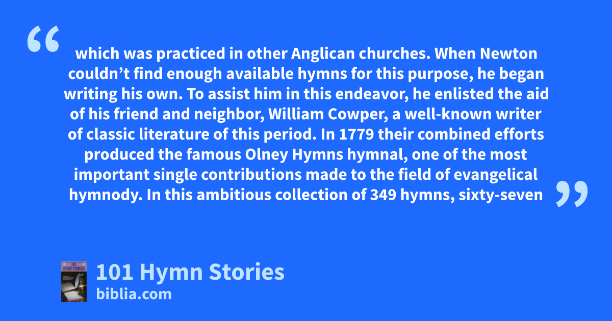 which was practiced in other Anglican churches. When Newton couldn’t find enough available hymns for this purpose, he began writing his own. To assist him in this endeavor, he enlisted the aid of his friend and neighbor, William Cowper, a well-known writer of classic literature of this period. In 1779 their combined efforts produced the famous Olney Hymns hymnal, one of the most important single contributions made to the field of evangelical hymnody. In this ambitious collection of 349 hymns, sixty-seven