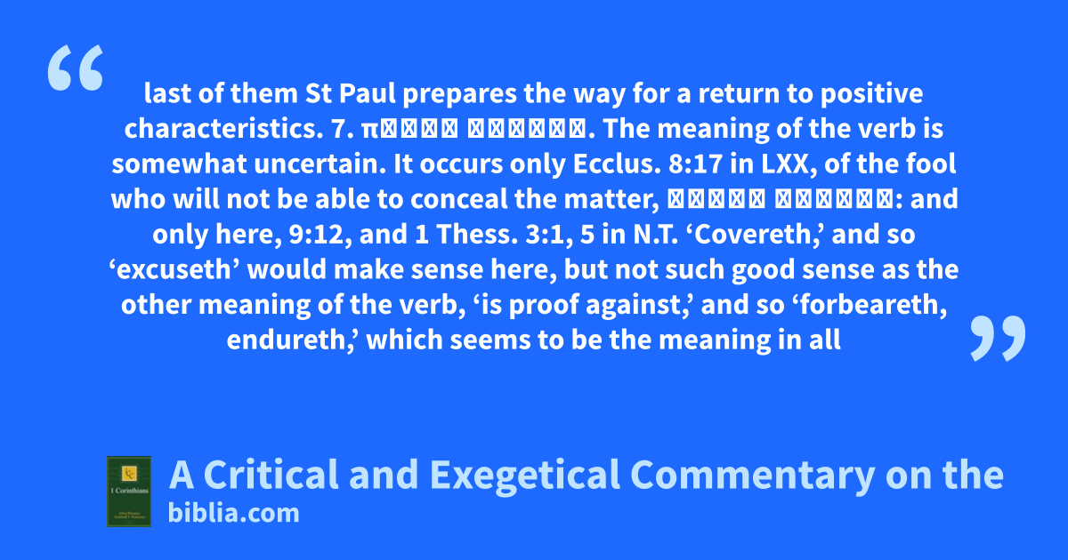 last of them St Paul prepares the way for a return to positive characteristics. 7. πάντα στέγει. The meaning of the verb is somewhat uncertain. It occurs only Ecclus. 8:17 in LXX, of the fool who will not be able to conceal the matter, λόγον στἐξαι: and only here, 9:12, and 1 Thess. 3:1, 5 in N.T. ‘Covereth,’ and so ‘excuseth’ would make sense here, but not such good sense as the other meaning of the verb, ‘is proof against,’ and so ‘forbeareth, endureth,’ which seems to be the meaning in all
