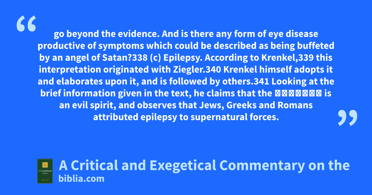 go beyond the evidence. And is there any form of eye disease productive of symptoms which could be described as being buffeted by an angel of Satan?338 (c) Epilepsy. According to Krenkel,339 this interpretation originated with Ziegler.340 Krenkel himself adopts it and elaborates upon it, and is followed by others.341 Looking at the brief information given in the text, he claims that the ἄγγελος is an evil spirit, and observes that Jews, Greeks and Romans attributed epilepsy to supernatural forces.