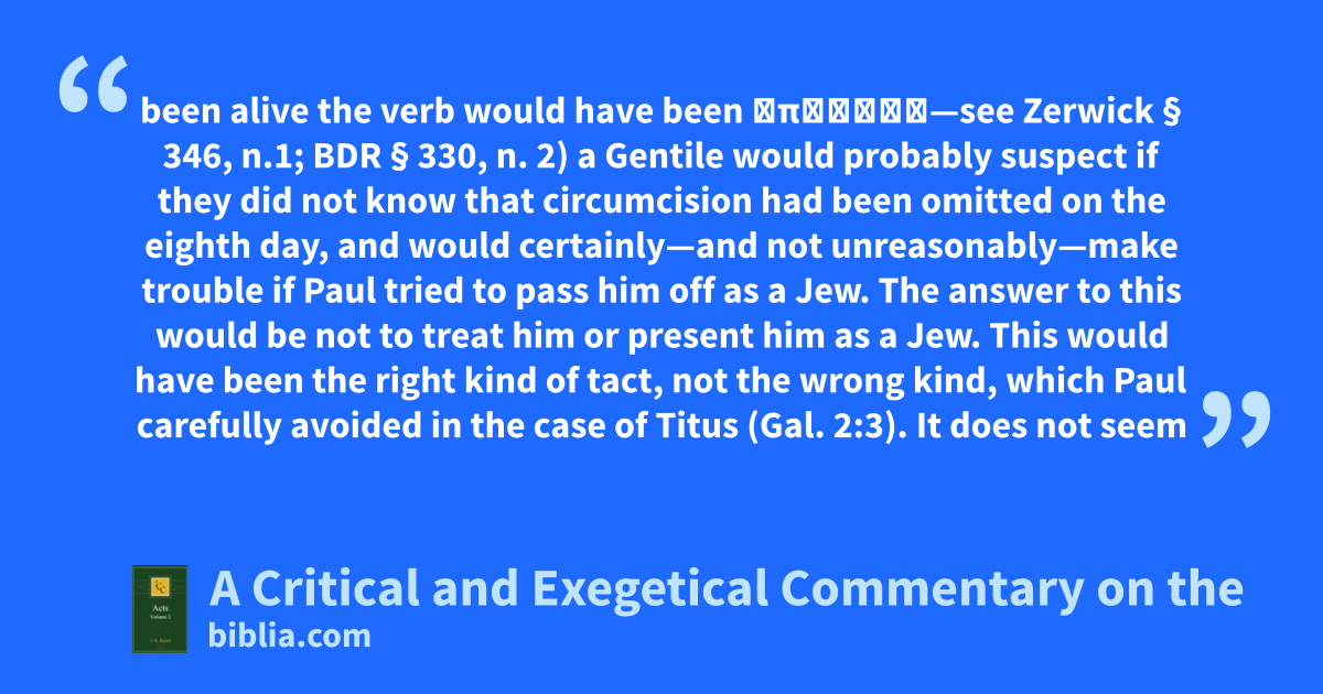 been alive the verb would have been ὑπάρχει—see Zerwick § 346, n.1; BDR § 330, n. 2) a Gentile would probably suspect if they did not know that circumcision had been omitted on the eighth day, and would certainly—and not unreasonably—make trouble if Paul tried to pass him off as a Jew. The answer to this would be not to treat him or present him as a Jew. This would have been the right kind of tact, not the wrong kind, which Paul carefully avoided in the case of Titus (Gal. 2:3). It does not seem