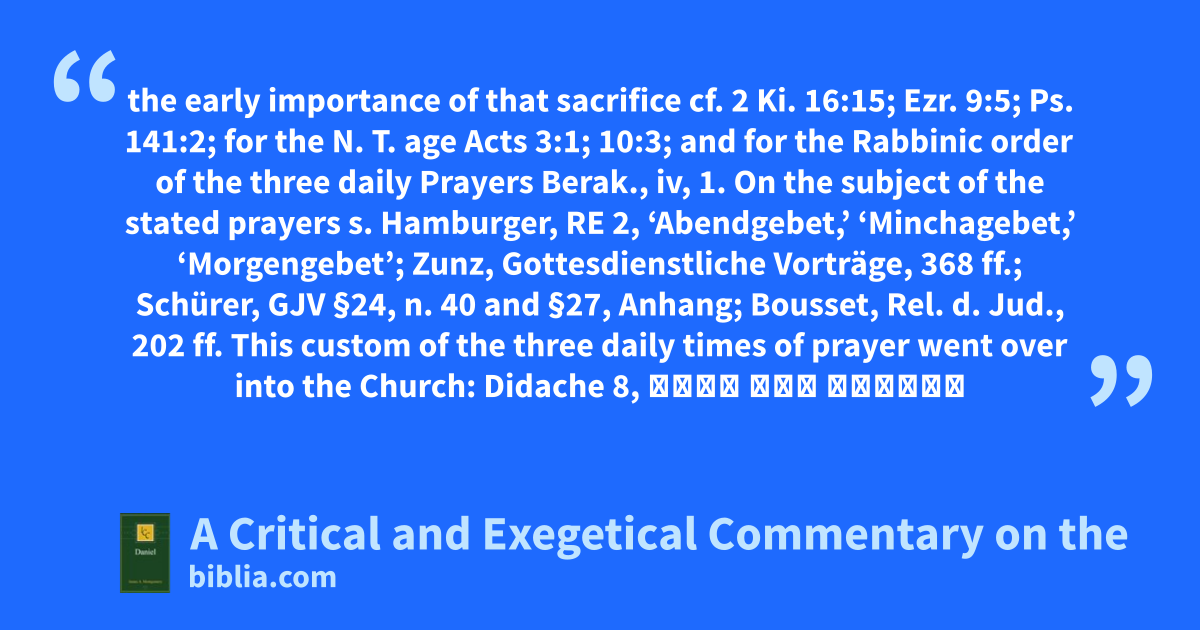 the early importance of that sacrifice cf. 2 Ki. 16:15; Ezr. 9:5; Ps. 141:2; for the N. T. age Acts 3:1; 10:3; and for the Rabbinic order of the three daily Prayers Berak., iv, 1. On the subject of the stated prayers s. Hamburger, RE 2, ‘Abendgebet,’ ‘Minchagebet,’ ‘Morgengebet’; Zunz, Gottesdienstliche Vorträge, 368 ff.; Schürer, GJV §24, n. 40 and §27, Anhang; Bousset, Rel. d. Jud., 202 ff. This custom of the three daily times of prayer went over into the Church: Didache 8, Τρὶς τῆς ἡμέρας