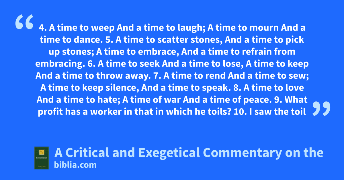 4. A time to weep And a time to laugh; A time to mourn And a time to dance. 5. A time to scatter stones, And a time to pick up stones; A time to embrace, And a time to refrain from embracing. 6. A time to seek And a time to lose, A time to keep And a time to throw away. 7. A time to rend And a time to sew; A time to keep silence, And a time to speak. 8. A time to love And a time to hate; A time of war And a time of peace. 9. What profit has a worker in that in which he toils? 10. I saw the toil