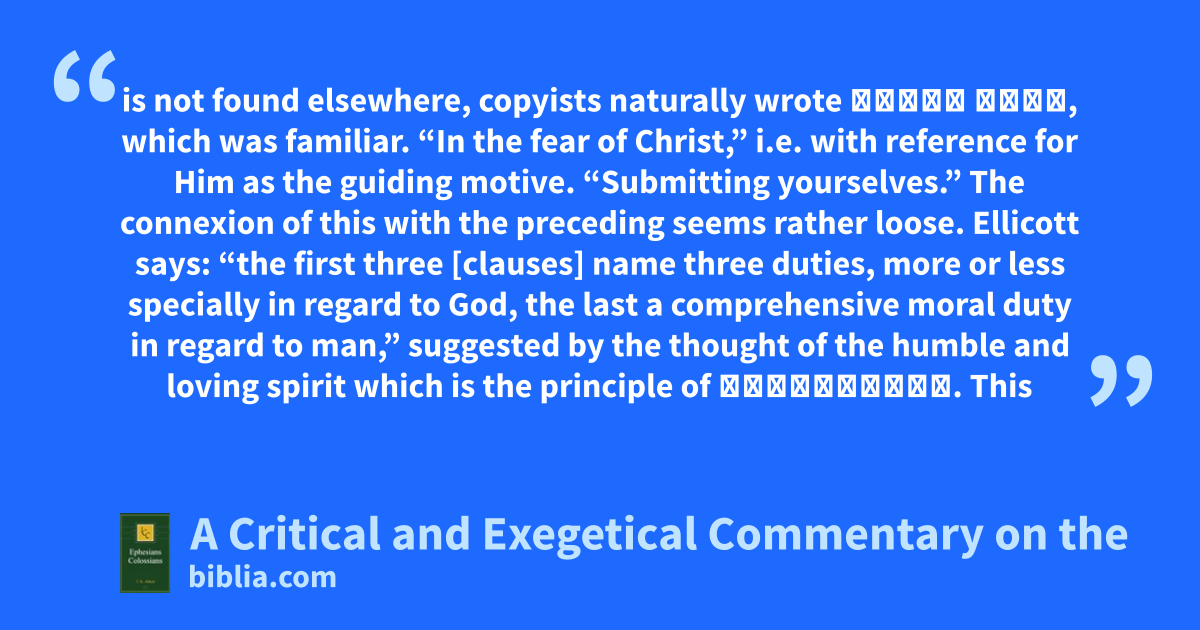 is not found elsewhere, copyists naturally wrote φόβος Θεοῦ, which was familiar. “In the fear of Christ,” i.e. with reference for Him as the guiding motive. “Submitting yourselves.” The connexion of this with the preceding seems rather loose. Ellicott says: “the first three [clauses] name three duties, more or less specially in regard to God, the last a comprehensive moral duty in regard to man,” suggested by the thought of the humble and loving spirit which is the principle of εὐχαριστία. This