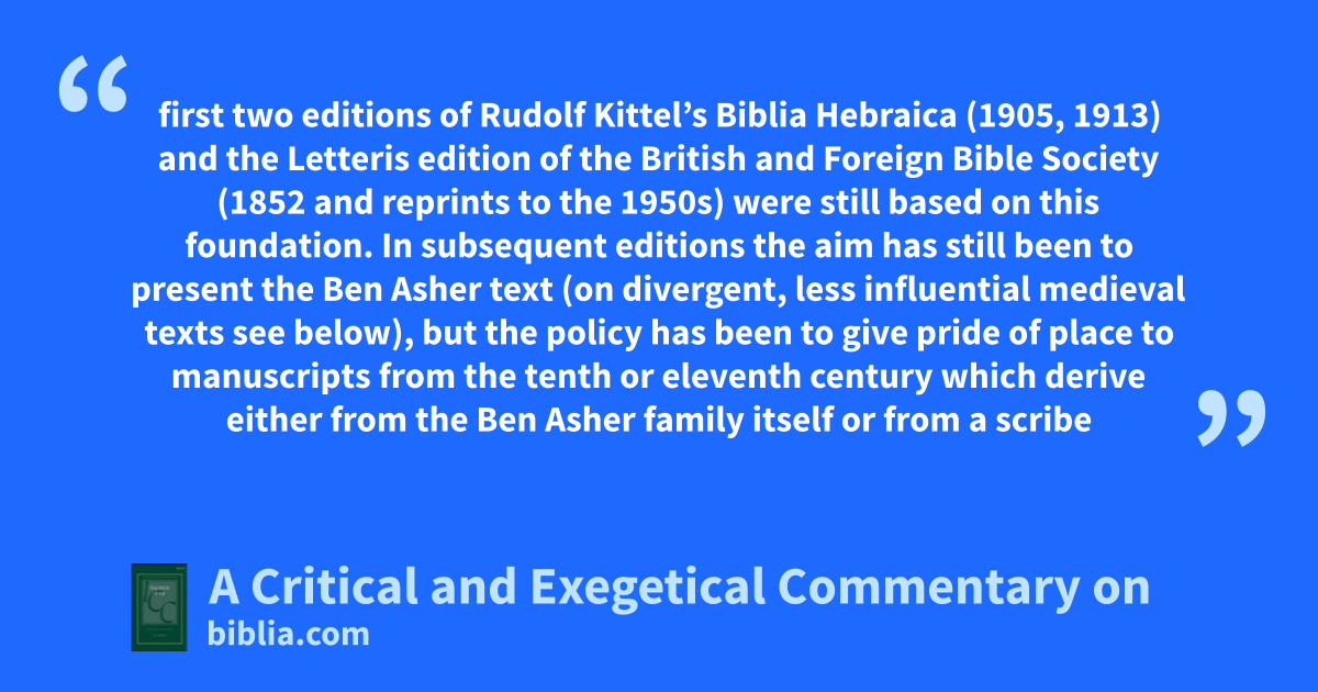 first two editions of Rudolf Kittel’s Biblia Hebraica (1905, 1913) and the Letteris edition of the British and Foreign Bible Society (1852 and reprints to the 1950s) were still based on this foundation. In subsequent editions the aim has still been to present the Ben Asher text (on divergent, less influential medieval texts see below), but the policy has been to give pride of place to manuscripts from the tenth or eleventh century which derive either from the Ben Asher family itself or from a scribe