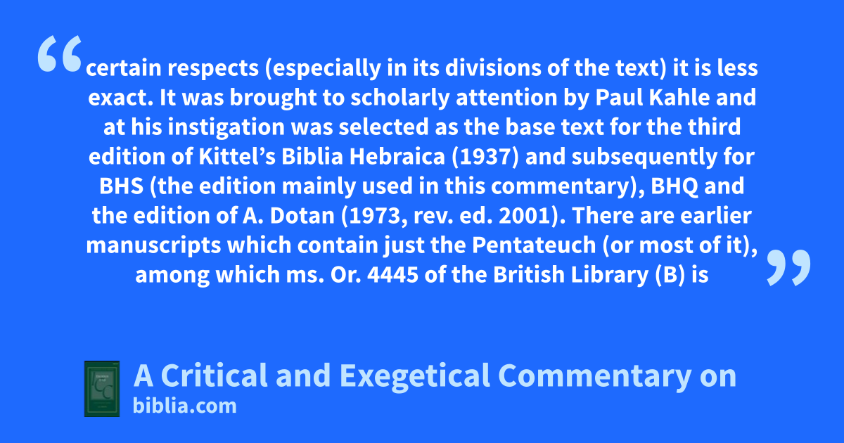 certain respects (especially in its divisions of the text) it is less exact. It was brought to scholarly attention by Paul Kahle and at his instigation was selected as the base text for the third edition of Kittel’s Biblia Hebraica (1937) and subsequently for BHS (the edition mainly used in this commentary), BHQ and the edition of A. Dotan (1973, rev. ed. 2001). There are earlier manuscripts which contain just the Pentateuch (or most of it), among which ms. Or. 4445 of the British Library (B) is