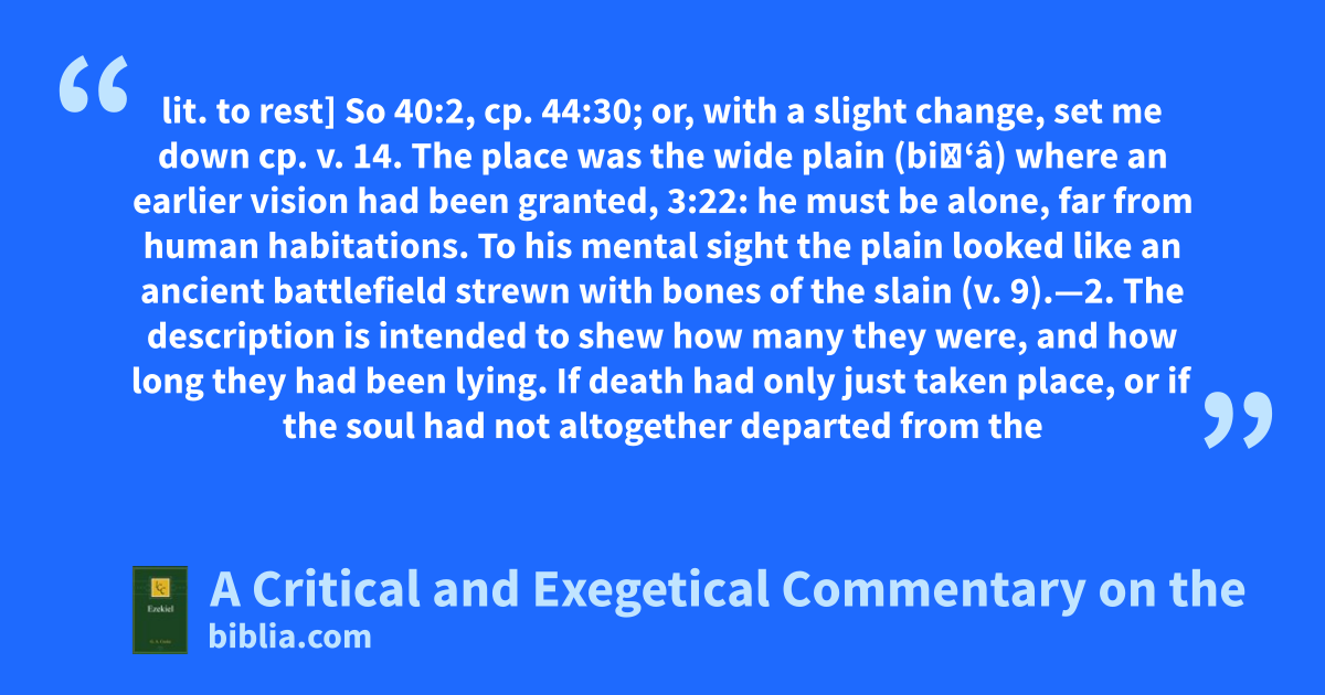lit. to rest] So 40:2, cp. 44:30; or, with a slight change, set me down cp. v. 14. The place was the wide plain (biḳ‘â) where an earlier vision had been granted, 3:22: he must be alone, far from human habitations. To his mental sight the plain looked like an ancient battlefield strewn with bones of the slain (v. 9).—2. The description is intended to shew how many they were, and how long they had been lying. If death had only just taken place, or if the soul had not altogether departed from the