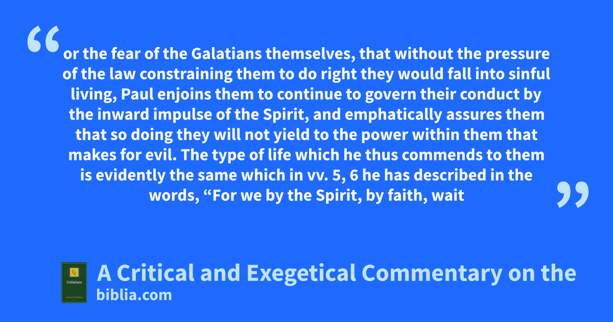 or the fear of the Galatians themselves, that without the pressure of the law constraining them to do right they would fall into sinful living, Paul enjoins them to continue to govern their conduct by the inward impulse of the Spirit, and emphatically assures them that so doing they will not yield to the power within them that makes for evil. The type of life which he thus commends to them is evidently the same which in vv. 5, 6 he has described in the words, “For we by the Spirit, by faith, wait