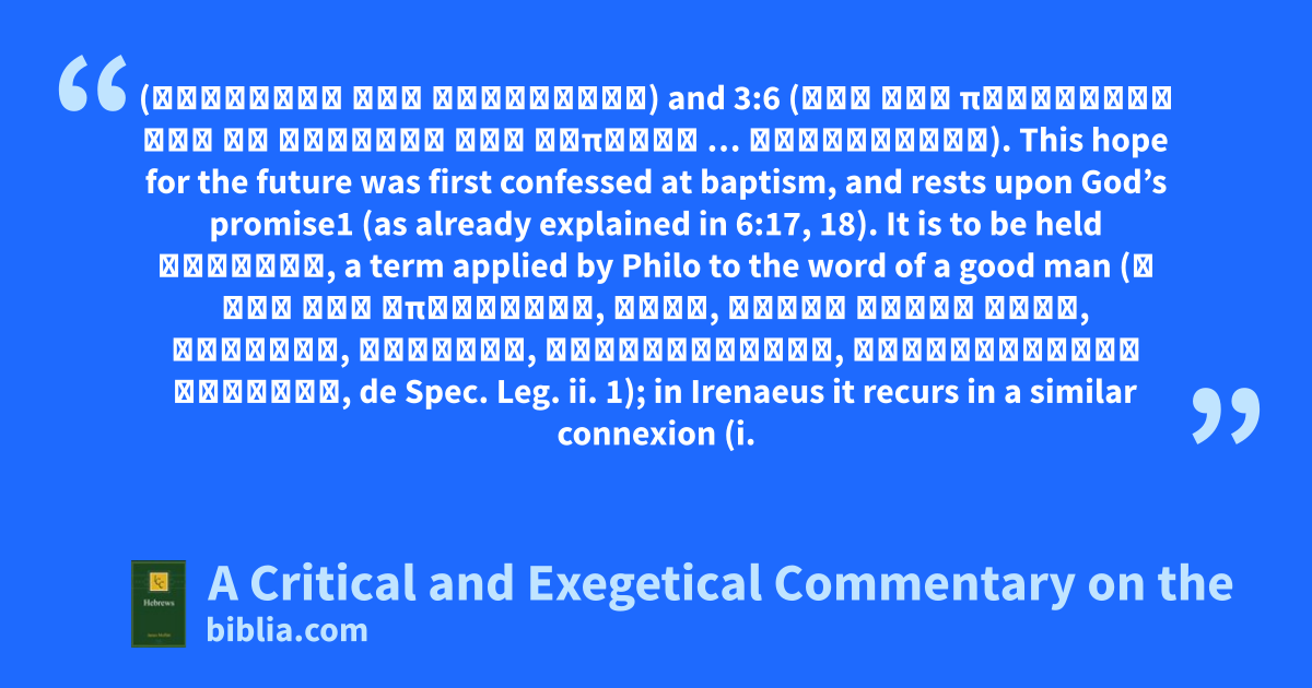(κρατῶμεν τῆς ὁμολογίας) and 3:6 (ἐὰν τὴν παρρησίαν καὶ τὸ καύχημα τῆς ἐλπίδος … κατάσχωμεν). This hope for the future was first confessed at baptism, and rests upon God’s promise1 (as already explained in 6:17, 18). It is to be held ἀκλινής, a term applied by Philo to the word of a good man (ὁ γὰρ τοῦ σπουδαίου, φησί, λόγος ὅρκος ἔστω, βέβαιος, ἀκλινής, ἀψευδέστατος, ἐρηρεισμένος ἀληθείᾳ, de Spec. Leg. ii. 1); in Irenaeus it recurs in a similar connexion (i.