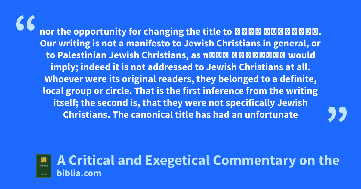 nor the opportunity for changing the title to Πρὸς Ἑβραίους. Our writing is not a manifesto to Jewish Christians in general, or to Palestinian Jewish Christians, as πρὸς Ἑβραίους would imply; indeed it is not addressed to Jewish Christians at all. Whoever were its original readers, they belonged to a definite, local group or circle. That is the first inference from the writing itself; the second is, that they were not specifically Jewish Christians. The canonical title has had an unfortunate