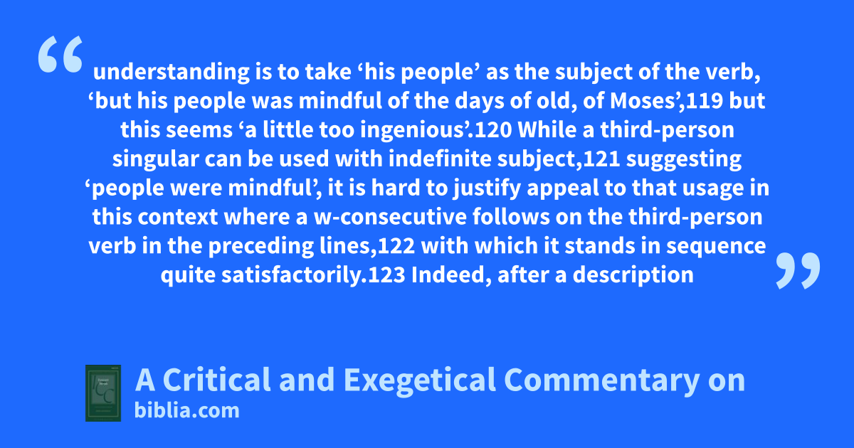 understanding is to take ‘his people’ as the subject of the verb, ‘but his people was mindful of the days of old, of Moses’,119 but this seems ‘a little too ingenious’.120 While a third-person singular can be used with indefinite subject,121 suggesting ‘people were mindful’, it is hard to justify appeal to that usage in this context where a w-consecutive follows on the third-person verb in the preceding lines,122 with which it stands in sequence quite satisfactorily.123 Indeed, after a description