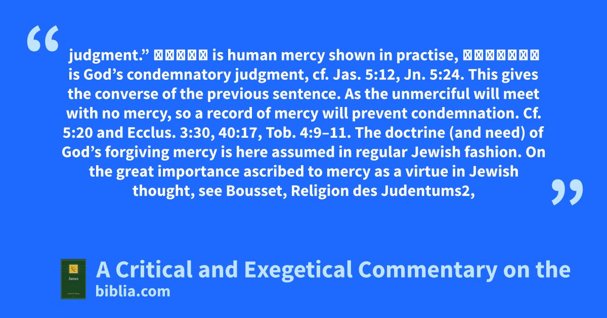 judgment.” ἔλεος is human mercy shown in practise, κρίσεως is God’s condemnatory judgment, cf. Jas. 5:12, Jn. 5:24. This gives the converse of the previous sentence. As the unmerciful will meet with no mercy, so a record of mercy will prevent condemnation. Cf. 5:20 and Ecclus. 3:30, 40:17, Tob. 4:9–11. The doctrine (and need) of God’s forgiving mercy is here assumed in regular Jewish fashion. On the great importance ascribed to mercy as a virtue in Jewish thought, see Bousset, Religion des Judentums2,