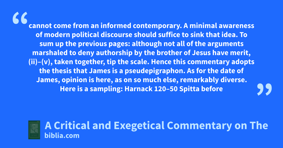 cannot come from an informed contemporary. A minimal awareness of modern political discourse should suffice to sink that idea. To sum up the previous pages: although not all of the arguments marshaled to deny authorship by the brother of Jesus have merit, (ii)–(v), taken together, tip the scale. Hence this commentary adopts the thesis that James is a pseudepigraphon. As for the date of James, opinion is here, as on so much else, remarkably diverse. Here is a sampling: Harnack 120–50 Spitta before