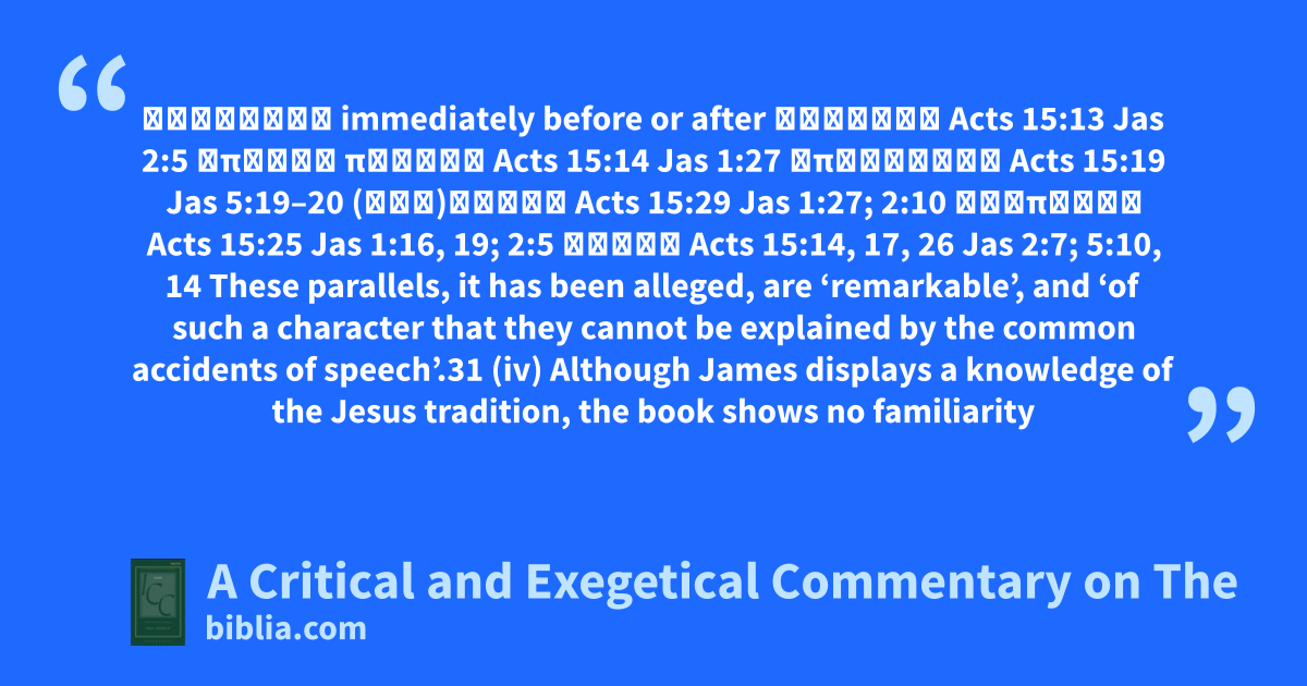 ἀκούσατε immediately before or after ἀδελφοί Acts 15:13 Jas 2:5 ἐπισκέ πτομαι Acts 15:14 Jas 1:27 ἐπιστρέφω Acts 15:19 Jas 5:19–20 (δια)τηρέω Acts 15:29 Jas 1:27; 2:10 ἀγαπητοί Acts 15:25 Jas 1:16, 19; 2:5 ὄνομα Acts 15:14, 17, 26 Jas 2:7; 5:10, 14 These parallels, it has been alleged, are ‘remarkable’, and ‘of such a character that they cannot be explained by the common accidents of speech’.31 (iv) Although James displays a knowledge of the Jesus tradition, the book shows no familiarity