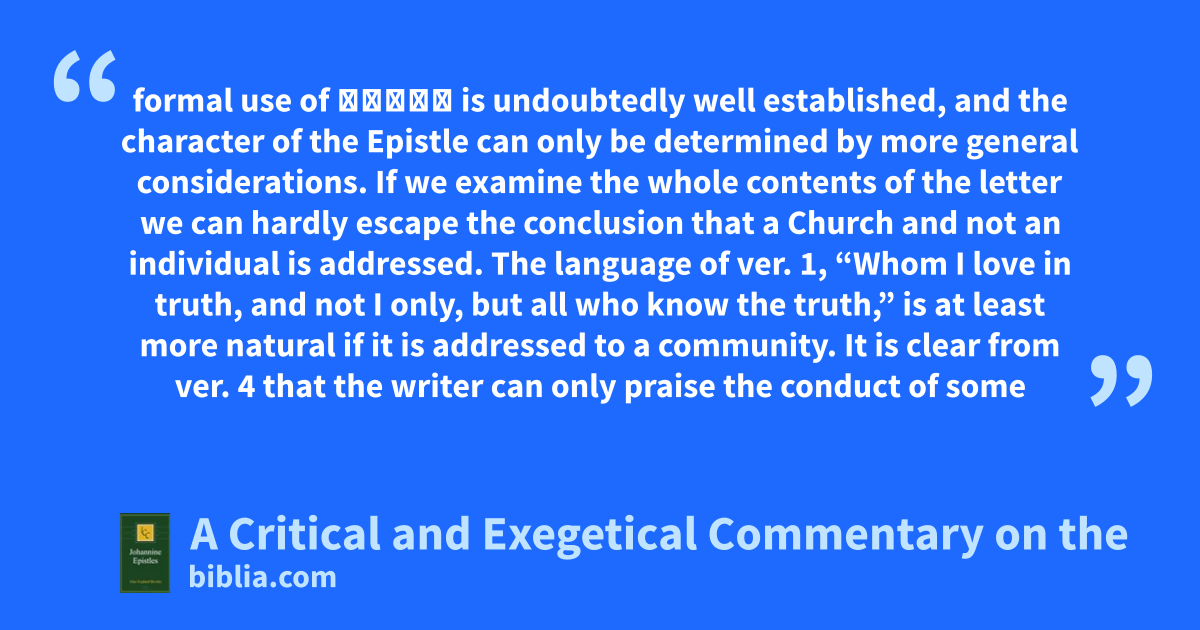 formal use of κυρία is undoubtedly well established, and the character of the Epistle can only be determined by more general considerations. If we examine the whole contents of the letter we can hardly escape the conclusion that a Church and not an individual is addressed. The language of ver. 1, “Whom I love in truth, and not I only, but all who know the truth,” is at least more natural if it is addressed to a community. It is clear from ver. 4 that the writer can only praise the conduct of some