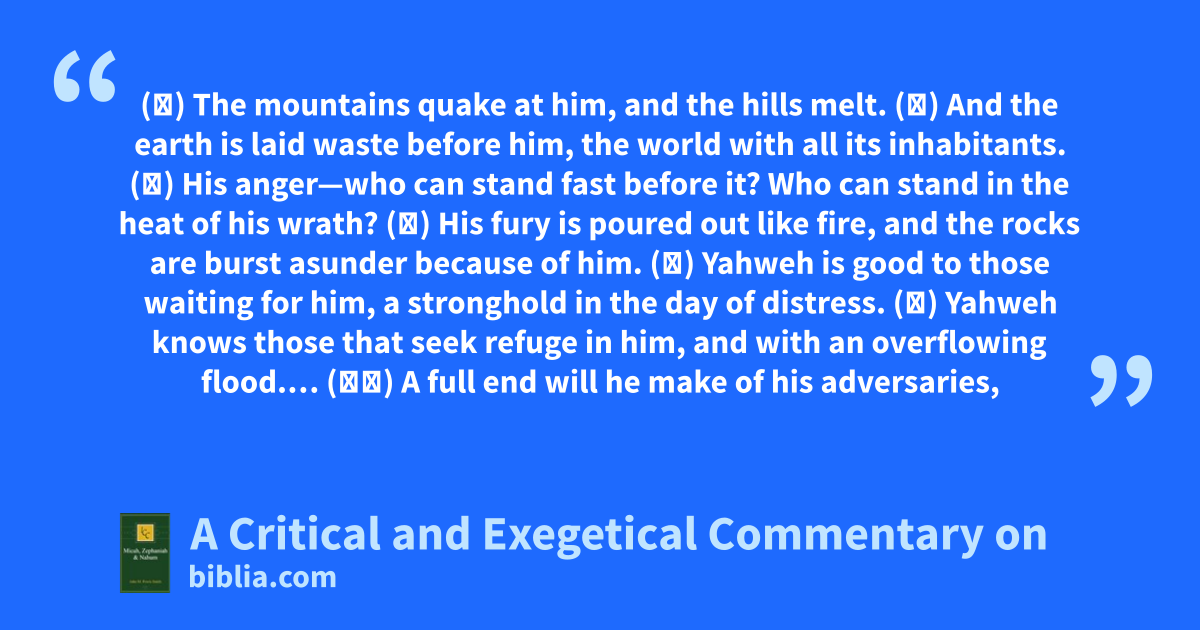 (ה) The mountains quake at him, and the hills melt. (ו) And the earth is laid waste before him, the world with all its inhabitants. (ז) His anger—who can stand fast before it? Who can stand in the heat of his wrath? (ח) His fury is poured out like fire, and the rocks are burst asunder because of him. (ט) Yahweh is good to those waiting for him, a stronghold in the day of distress. (י) Yahweh knows those that seek refuge in him, and with an overflowing flood.… (כ‍) A full end will he make of his adversaries,