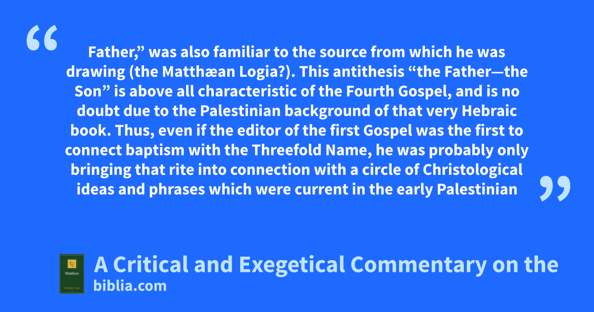 Father,” was also familiar to the source from which he was drawing (the Matthæan Logia?). This antithesis “the Father—the Son” is above all characteristic of the Fourth Gospel, and is no doubt due to the Palestinian background of that very Hebraic book. Thus, even if the editor of the first Gospel was the first to connect baptism with the Threefold Name, he was probably only bringing that rite into connection with a circle of Christological ideas and phrases which were current in the early Palestinian
