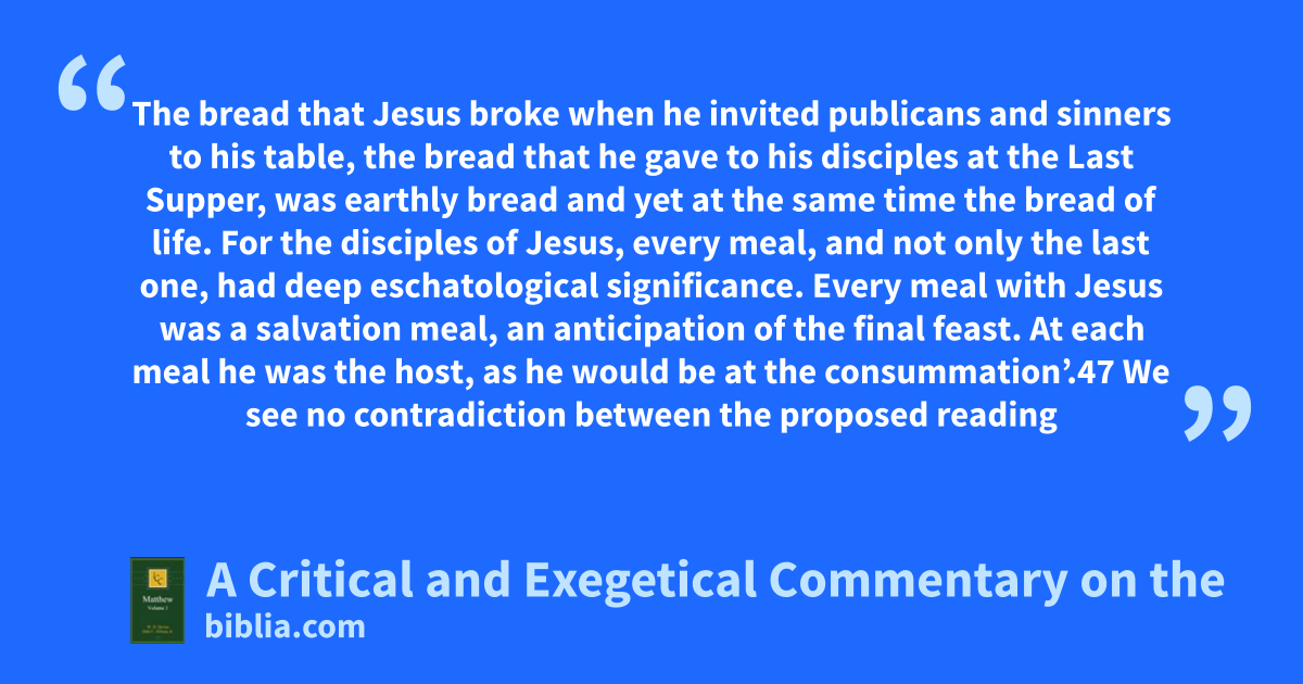 The bread that Jesus broke when he invited publicans and sinners to his table, the bread that he gave to his disciples at the Last Supper, was earthly bread and yet at the same time the bread of life. For the disciples of Jesus, every meal, and not only the last one, had deep eschatological significance. Every meal with Jesus was a salvation meal, an anticipation of the final feast. At each meal he was the host, as he would be at the consummation’.47 We see no contradiction between the proposed reading