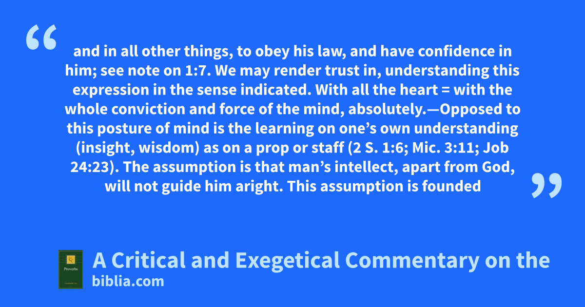 and in all other things, to obey his law, and have confidence in him; see note on 1:7. We may render trust in, understanding this expression in the sense indicated. With all the heart = with the whole conviction and force of the mind, absolutely.—Opposed to this posture of mind is the learning on one’s own understanding (insight, wisdom) as on a prop or staff (2 S. 1:6; Mic. 3:11; Job 24:23). The assumption is that man’s intellect, apart from God, will not guide him aright. This assumption is founded