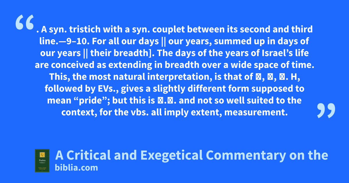 . A syn. tristich with a syn. couplet between its second and third line.—9–10. For all our days || our years, summed up in days of our years || their breadth]. The days of the years of Israel’s life are conceived as extending in breadth over a wide space of time. This, the most natural interpretation, is that of 𝔊, 𝖁, 𝕵. H, followed by EVs., gives a slightly different form supposed to mean “pride”; but this is α.λ. and not so well suited to the context, for the vbs. all imply extent, measurement.