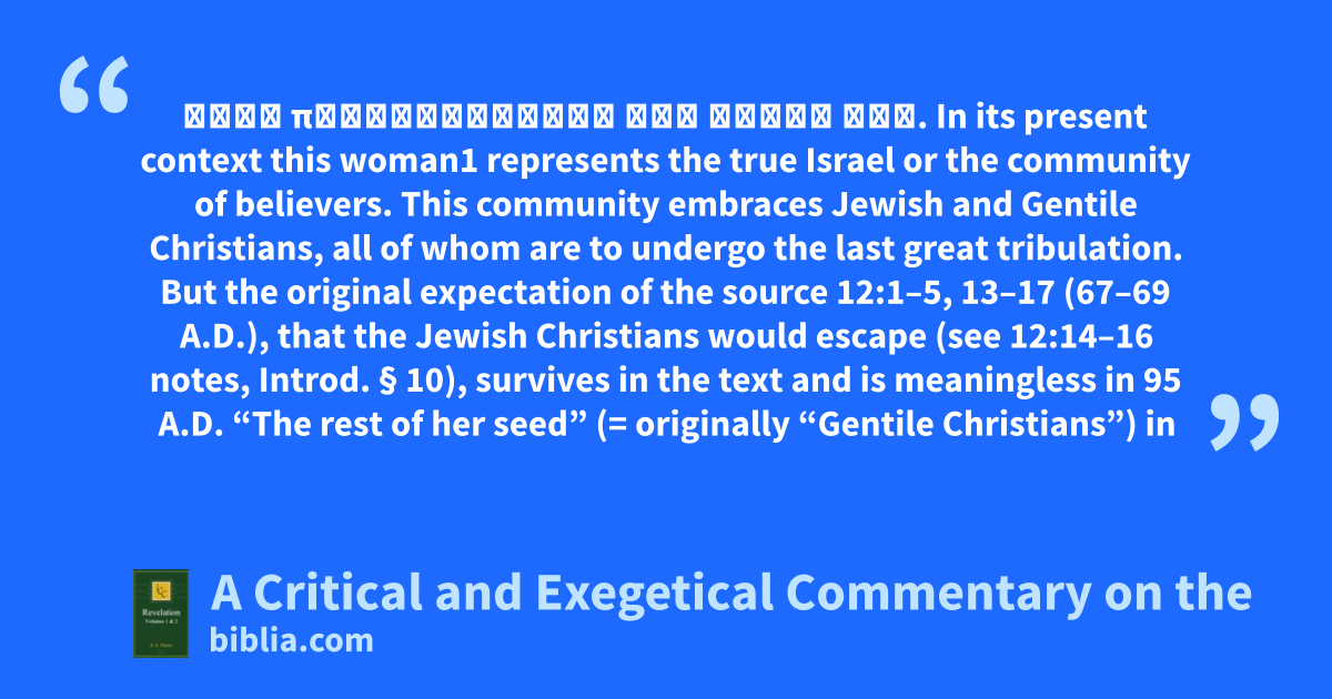 γυνὴ περιβεβλημένη τὸν ἥλιον κτλ. In its present context this woman1 represents the true Israel or the community of believers. This community embraces Jewish and Gentile Christians, all of whom are to undergo the last great tribulation. But the original expectation of the source 12:1–5, 13–17 (67–69 A.D.), that the Jewish Christians would escape (see 12:14–16 notes, Introd. § 10), survives in the text and is meaningless in 95 A.D. “The rest of her seed” (= originally “Gentile Christians”) in