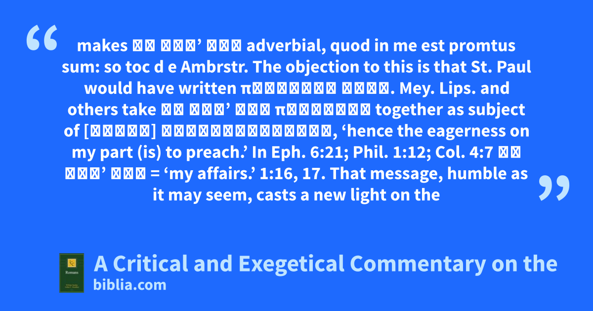 makes τὸ κατʼ ἐμέ adverbial, quod in me est promtus sum: so toc d e Ambrstr. The objection to this is that St. Paul would have written πρόθυμός εἰμι. Mey. Lips. and others take τὸ κατʼ ἐμὲ πρόθυμον together as subject of [ἐστιν] εὐαγγελίσασθαι, ‘hence the eagerness on my part (is) to preach.’ In Eph. 6:21; Phil. 1:12; Col. 4:7 τὰ κατʼ ἐμέ = ‘my affairs.’ 1:16, 17. That message, humble as it may seem, casts a new light on the