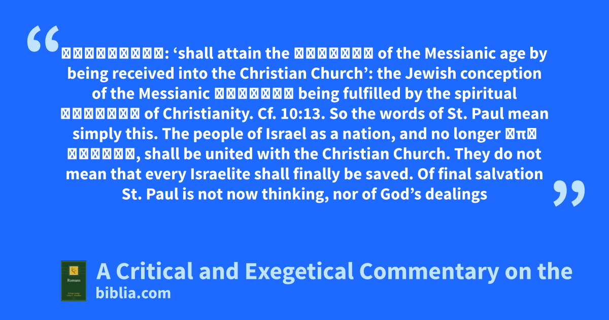 σωθήσεται: ‘shall attain the σωτηρία of the Messianic age by being received into the Christian Church’: the Jewish conception of the Messianic σωτηρία being fulfilled by the spiritual σωτηρία of Christianity. Cf. 10:13. So the words of St. Paul mean simply this. The people of Israel as a nation, and no longer ἀπὸ μέρους, shall be united with the Christian Church. They do not mean that every Israelite shall finally be saved. Of final salvation St. Paul is not now thinking, nor of God’s dealings