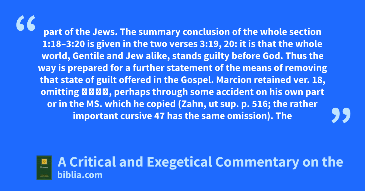 part of the Jews. The summary conclusion of the whole section 1:18–3:20 is given in the two verses 3:19, 20: it is that the whole world, Gentile and Jew alike, stands guilty before God. Thus the way is prepared for a further statement of the means of removing that state of guilt offered in the Gospel. Marcion retained ver. 18, omitting Θεοῦ, perhaps through some accident on his own part or in the MS. which he copied (Zahn, ut sup. p. 516; the rather important cursive 47 has the same omission). The