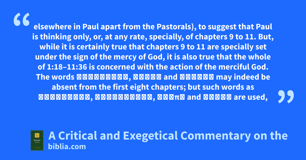elsewhere in Paul apart from the Pastorals), to suggest that Paul is thinking only, or, at any rate, specially, of chapters 9 to 11. But, while it is certainly true that chapters 9 to 11 are specially set under the sign of the mercy of God, it is also true that the whole of 1:18–11:36 is concerned with the action of the merciful God. The words οἰκτίρειν, ἔλεος and ἐλεεῖν may indeed be absent from the first eight chapters; but such words as χρηστότης, μακροθυμία, ἀγάπη and χάρις are used,