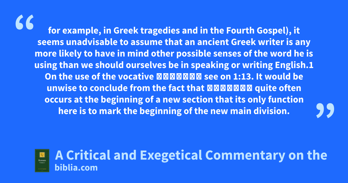 for example, in Greek tragedies and in the Fourth Gospel), it seems unadvisable to assume that an ancient Greek writer is any more likely to have in mind other possible senses of the word he is using than we should ourselves be in speaking or writing English.1 On the use of the vocative ἀδελφοί see on 1:13. It would be unwise to conclude from the fact that ἀδελφοί quite often occurs at the beginning of a new section that its only function here is to mark the beginning of the new main division.
