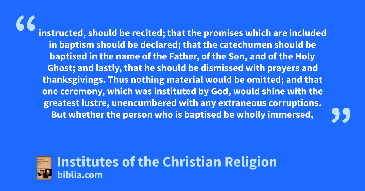 instructed, should be recited; that the promises which are included in baptism should be declared; that the catechumen should be baptised in the name of the Father, of the Son, and of the Holy Ghost; and lastly, that he should be dismissed with prayers and thanksgivings. Thus nothing material would be omitted; and that one ceremony, which was instituted by God, would shine with the greatest lustre, unencumbered with any extraneous corruptions. But whether the person who is baptised be wholly immersed,