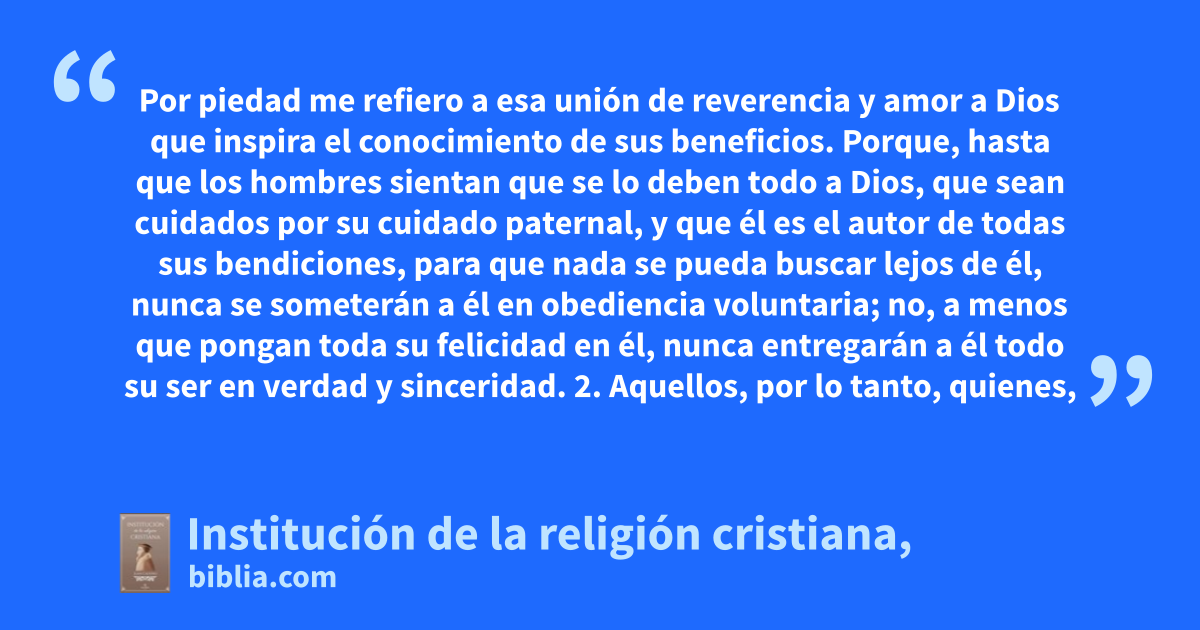 Por piedad me refiero a esa unión de reverencia y amor a Dios que inspira el conocimiento de sus beneficios. Porque, hasta que los hombres sientan que se lo deben todo a Dios, que sean cuidados por su cuidado paternal, y que él es el autor de todas sus bendiciones, para que nada se pueda buscar lejos de él, nunca se someterán a él en obediencia voluntaria; no, a menos que pongan toda su felicidad en él, nunca entregarán a él todo su ser en verdad y sinceridad. 2. Aquellos, por lo tanto, quienes,