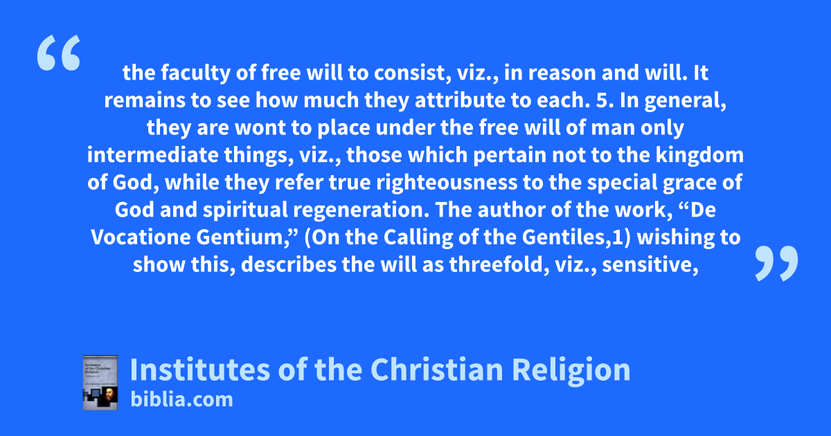 the faculty of free will to consist, viz., in reason and will. It remains to see how much they attribute to each. 5. In general, they are wont to place under the free will of man only intermediate things, viz., those which pertain not to the kingdom of God, while they refer true righteousness to the special grace of God and spiritual regeneration. The author of the work, “De Vocatione Gentium,” (On the Calling of the Gentiles,1) wishing to show this, describes the will as threefold, viz., sensitive,