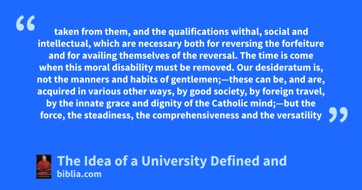 taken from them, and the qualifications withal, social and intellectual, which are necessary both for reversing the forfeiture and for availing themselves of the reversal. The time is come when this moral disability must be removed. Our desideratum is, not the manners and habits of gentlemen;—these can be, and are, acquired in various other ways, by good society, by foreign travel, by the innate grace and dignity of the Catholic mind;—but the force, the steadiness, the comprehensiveness and the versatility
