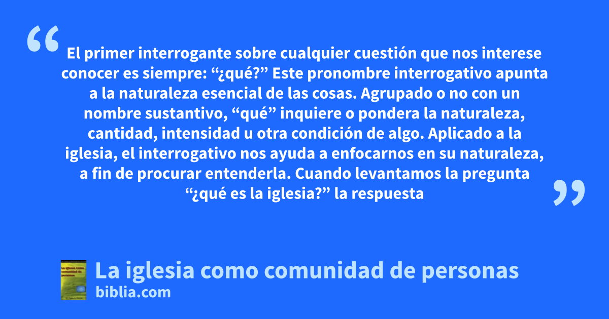El primer interrogante sobre cualquier cuestión que nos interese conocer es siempre: “¿qué?” Este pronombre interrogativo apunta a la naturaleza esencial de las cosas. Agrupado o no con un nombre sustantivo, “qué” inquiere o pondera la naturaleza, cantidad, intensidad u otra condición de algo. Aplicado a la iglesia, el interrogativo nos ayuda a enfocarnos en su naturaleza, a fin de procurar entenderla. Cuando levantamos la pregunta “¿qué es la iglesia?” la respuesta