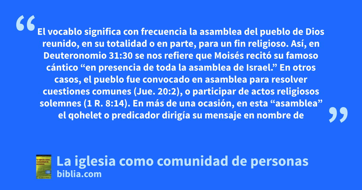 El vocablo significa con frecuencia la asamblea del pueblo de Dios reunido, en su totalidad o en parte, para un fin religioso. Así, en Deuteronomio 31:30 se nos refiere que Moisés recitó su famoso cántico “en presencia de toda la asamblea de Israel.” En otros casos, el pueblo fue convocado en asamblea para resolver cuestiones comunes (Jue. 20:2), o participar de actos religiosos solemnes (1 R. 8:14). En más de una ocasión, en esta “asamblea” el qohelet o predicador dirigía su mensaje en nombre de