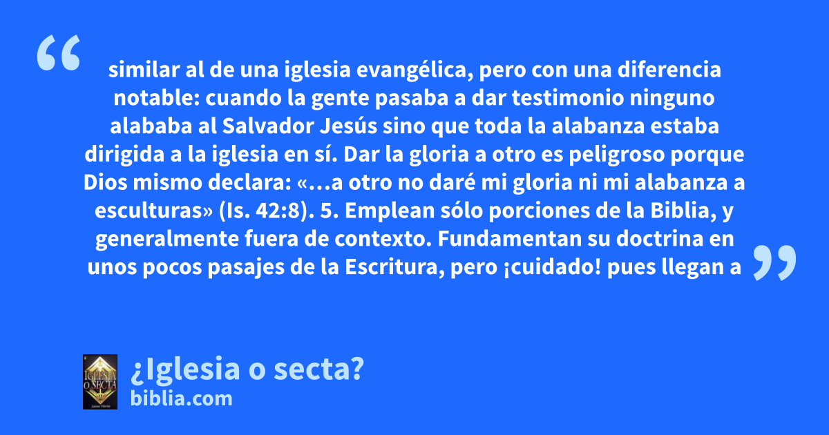 similar al de una iglesia evangélica, pero con una diferencia notable: cuando la gente pasaba a dar testimonio ninguno alababa al Salvador Jesús sino que toda la alabanza estaba dirigida a la iglesia en sí. Dar la gloria a otro es peligroso porque Dios mismo declara: «…a otro no daré mi gloria ni mi alabanza a esculturas» (Is. 42:8). 5. Emplean sólo porciones de la Biblia, y generalmente fuera de contexto. Fundamentan su doctrina en unos pocos pasajes de la Escritura, pero ¡cuidado! pues llegan a