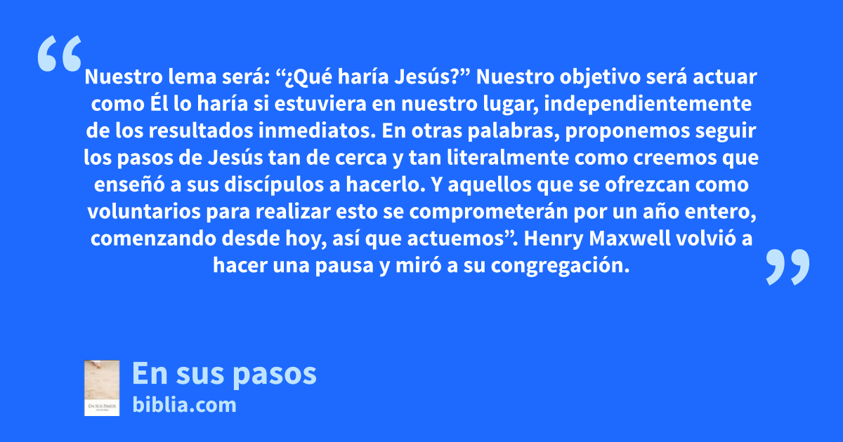 Nuestro lema será: “¿Qué haría Jesús?” Nuestro objetivo será actuar como Él lo haría si estuviera en nuestro lugar, independientemente de los resultados inmediatos. En otras palabras, proponemos seguir los pasos de Jesús tan de cerca y tan literalmente como creemos que enseñó a sus discípulos a hacerlo. Y aquellos que se ofrezcan como voluntarios para realizar esto se comprometerán por un año entero, comenzando desde hoy, así que actuemos”. Henry Maxwell volvió a hacer una pausa y miró a su congregación.