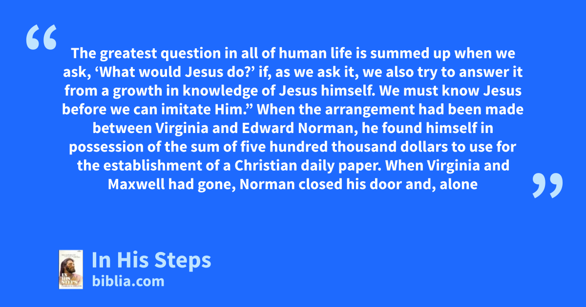 The greatest question in all of human life is summed up when we ask, ‘What would Jesus do?’ if, as we ask it, we also try to answer it from a growth in knowledge of Jesus himself. We must know Jesus before we can imitate Him.” When the arrangement had been made between Virginia and Edward Norman, he found himself in possession of the sum of five hundred thousand dollars to use for the establishment of a Christian daily paper. When Virginia and Maxwell had gone, Norman closed his door and, alone